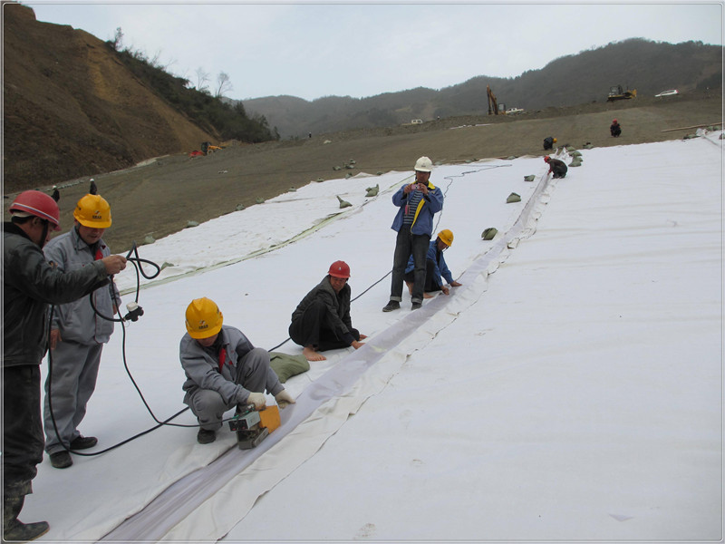 復合土工膜順坡鋪設,搭接方向要上坡壓下坡,上游壓下游,以防水流沖刷造成損壞,鋪膜時要留有褶皺,但應與壩面貼緊,不留空隙。壩坡在錨固槽部位設10cm寬折疊伸縮帶。松緊度不少于 5%,以適應不同情況的變形,鋪膜時要趕掉膜下氣泡,鋪膜時嚴禁工作人員穿帶釘的鞋進行作業。復合土工膜在結合部位要通過結合槽連接,確保結合部位的連接起到防滲作用。